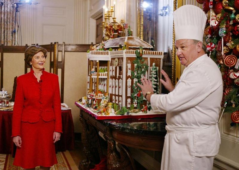 2003年12月4日,在白宫节日装饰预展期间,当时的“第一夫人”劳拉·布什聆听梅斯尼耶解释“姜饼白宫”的制作成分。