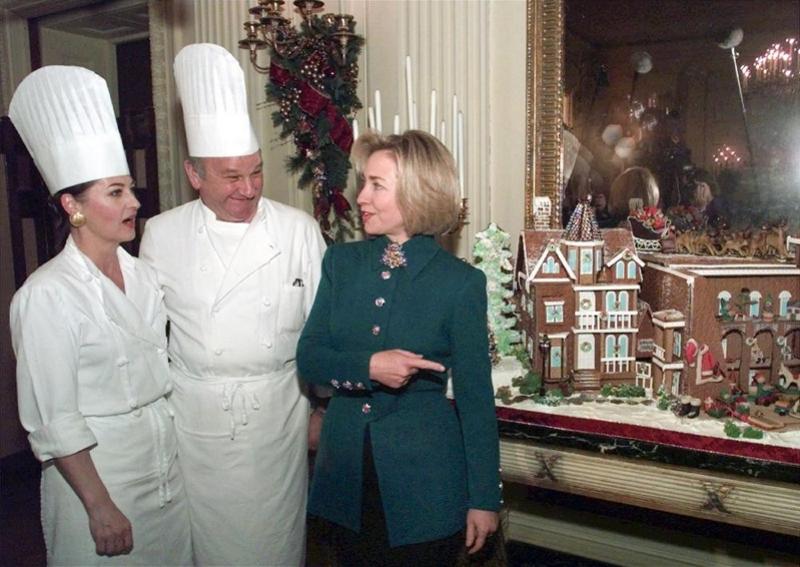 1997年12月3日,当时的第一夫人希拉里·克林顿与梅斯尼耶及其助手在节日装饰发布会上展示80磅的姜饼屋创作:用糖霜、杏仁和巧克力装饰。