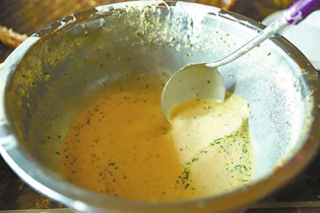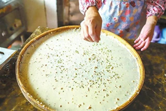 将米浆舀到簸箕里摊薄摇匀,然后将葱花等佐料撒在米浆上