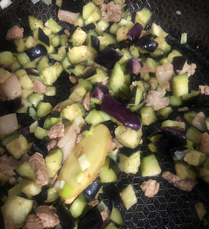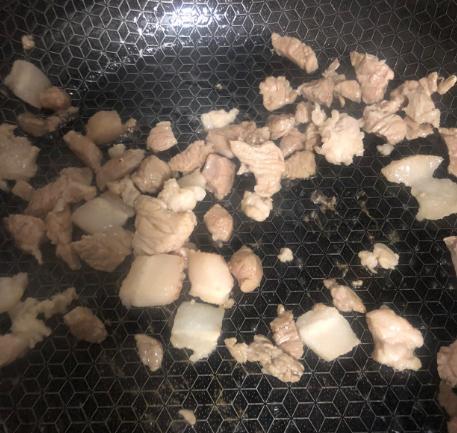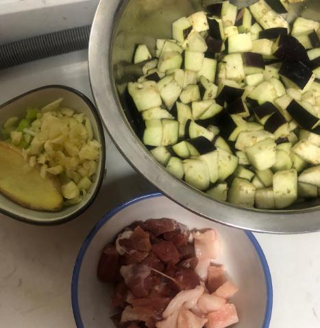 除了茄子之外,其它食材也要准备好,将肉切成若干小丁,也不要太小,否则就没有肉丁的口感了,将葱姜蒜都切成小丁,这时候起锅,将油烧至7成热,随后再放入我们切好的猪肉丁。