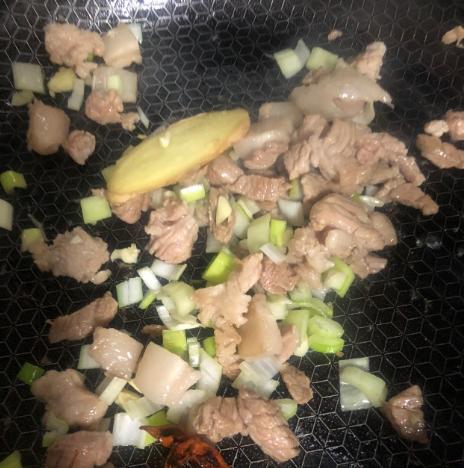 将猪肉煸炒几下之后,放入我们的其他配料,继续煸炒,为什么烧七成热,是因为油温太高,肉质瞬间就会被破坏,肉就会发硬,没有口感了,而且这些调配料下入锅中都会糊,味道会大打折扣。