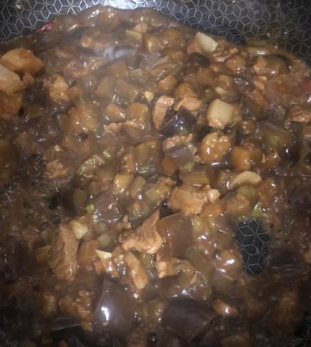 等到汤汁收得差不多了之后,不要等到汤汁都收进去,锅中还剩下一些汤汁,这时候勾芡,将水淀粉全部倒入锅中,煸炒一下,会发现茄子肉慢慢变粘稠了,我们的卤子出行也就出现了。