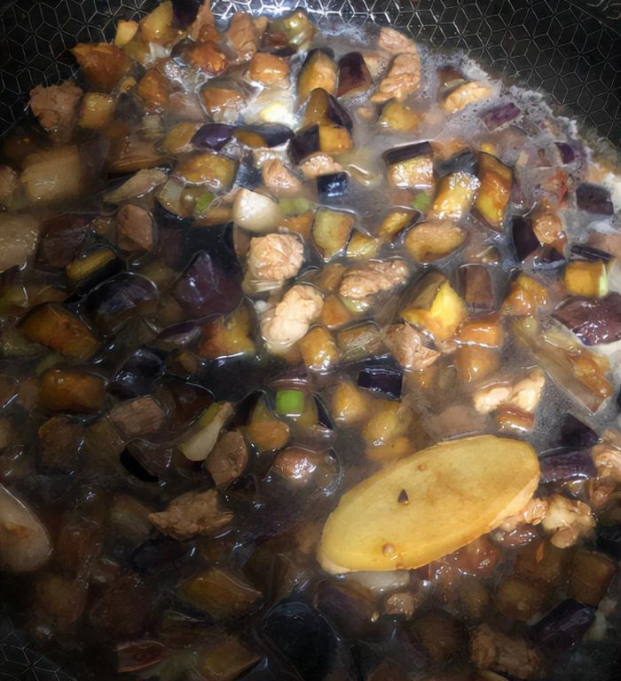 感觉茄子已经微微褶皱了,并且能够闻到香味了,就可以进行最后一步了,锅中加入清水,微微平齐于茄子就可以,大火烧开,随后转小火,让茄子和肉将汁水全部收进去,这样味道会更加好。