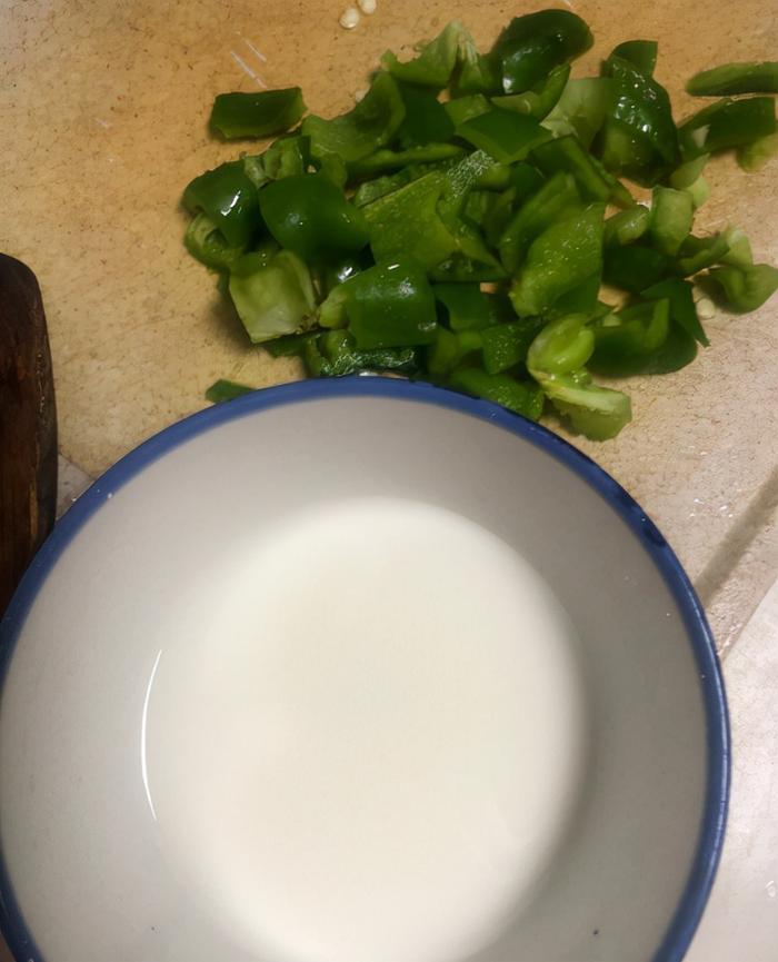接下来准备勾芡,也就是水淀粉,取一些干淀粉,放入碗中,碗中加入少许的清水,不要太多,淀粉也不要太多,调制少许的水淀粉,准备放入锅中,此时再切一些青椒,准备一会调味使用。