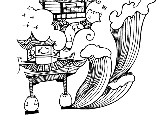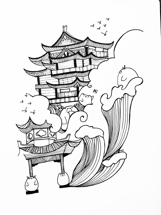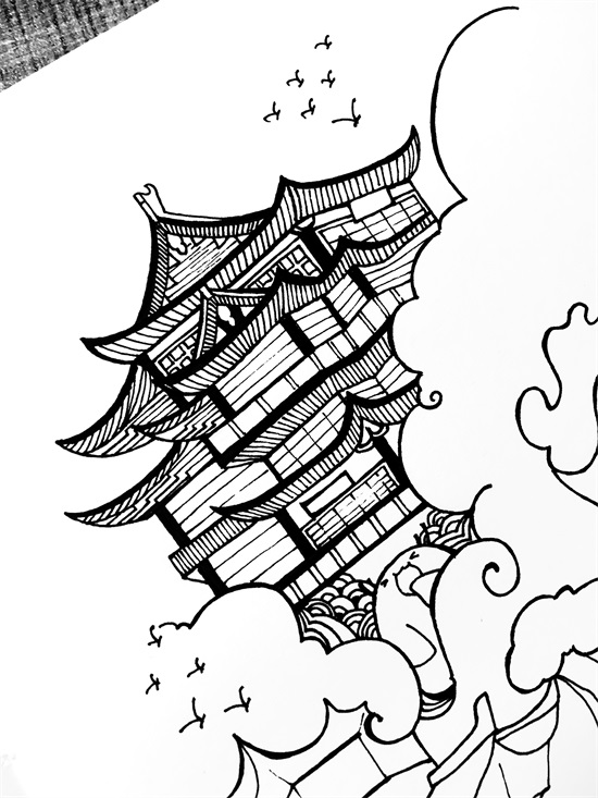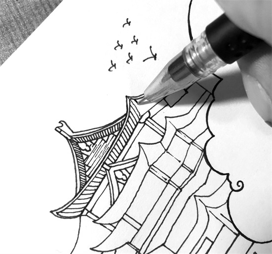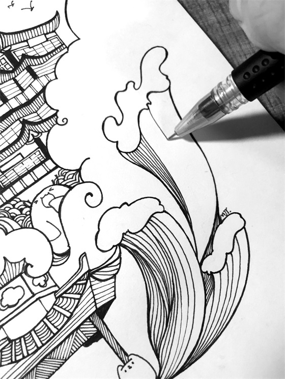 中性笔描出轮廓,注意线条的流畅度,主要就是云和水的线比较长;