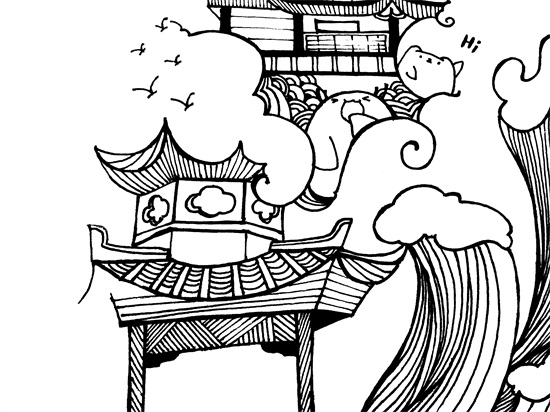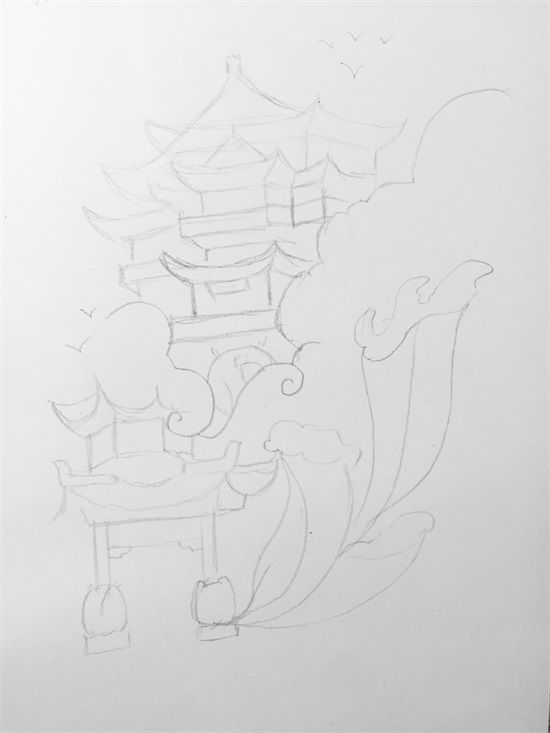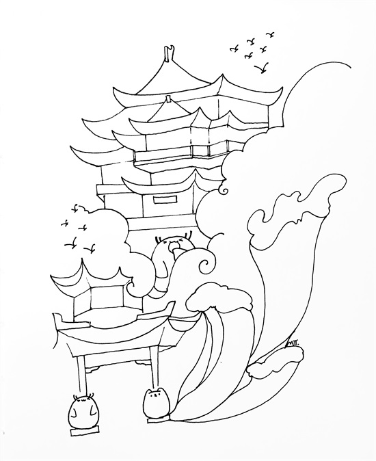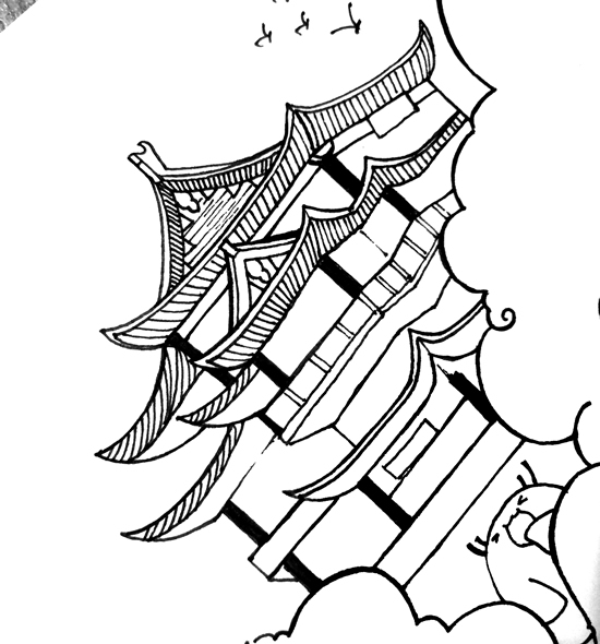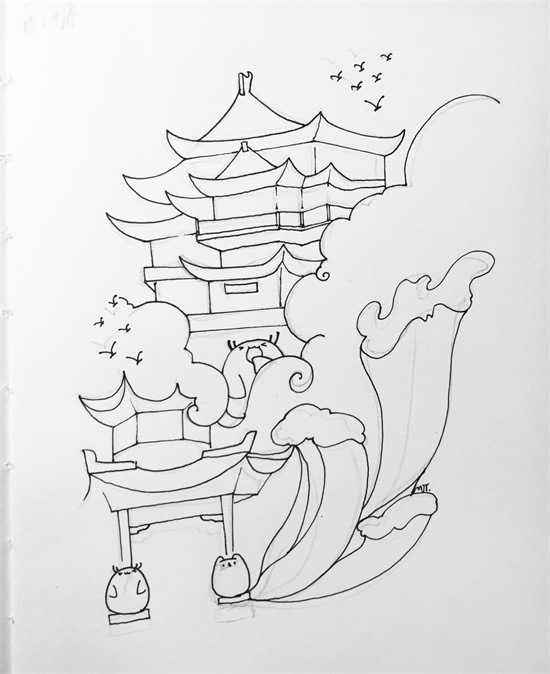 先用铅笔画出整体的构图,这次小白和小伙伴充当门童啦,在亭子两边站岗;