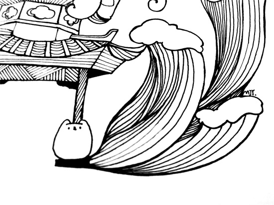 稍微加粗一下云层和水浪的线条;