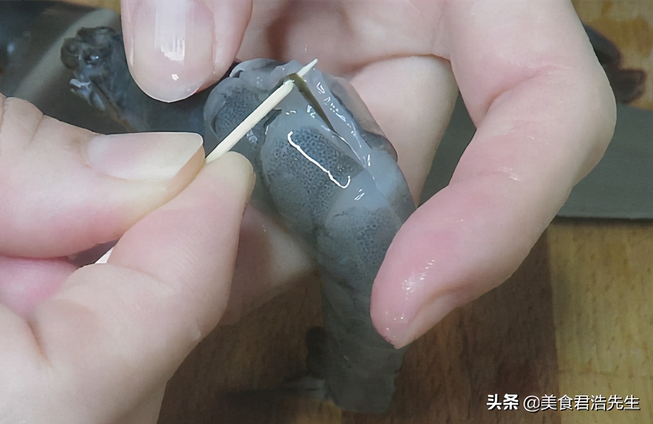 3、处理大虾,先用剪刀剪去虾腿和触须,再用刀在虾背切一刀,用牙签挑出黑色的虾肠,注意一定要轻轻挑出,不然虾肠很容易断。
