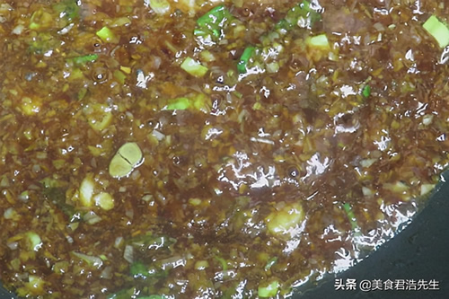 7、加入一把葱花,继续煸炒20秒,蒜蓉酱就完成 了。