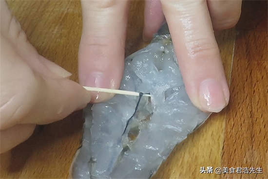 4、挑出虾肠后,用刀给大虾开背,再用手轻轻拨开大虾的背部,用牙签挑出虾筋。