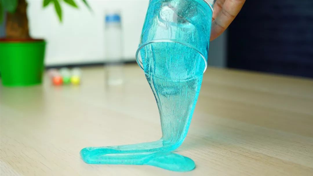通过上面的实验我们发现,随着硼砂水的倒入,胶水混合物变得越来越粘稠并最终变成半液态半固态的百变“史莱姆”。
