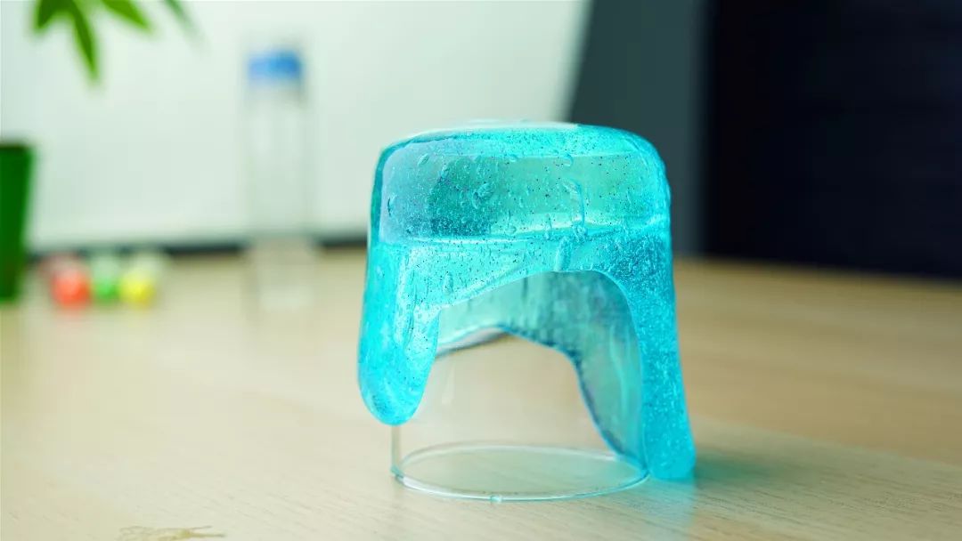 5.尝试将制作好的“史莱姆”倒出水杯,并变换不同的形状。