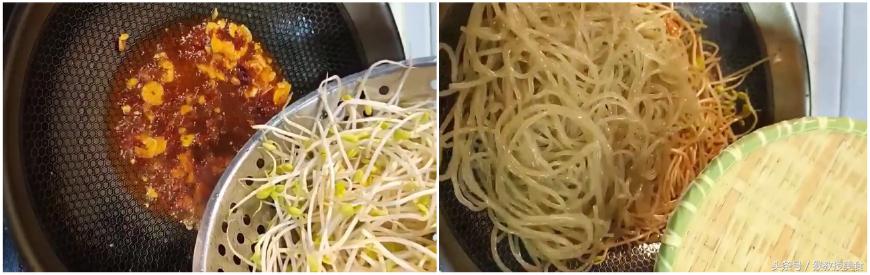 第二步:这一步需要用到粉条,一定要得前用水泡软,或者用另外一个锅,把粉条煮至五分软以后再用,这样炒出来的粉条才会非常好吃,又稍稍带点嚼头。炒出红油的锅中倒入黄豆芽和粉条,炒至豆芽和粉条都熟透,粉条比较吸水,如果干了, 需要少加点清水。