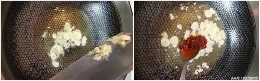 第一步:炒锅中放点食用油,放蒜片和一勺豆瓣酱,炒出红油。