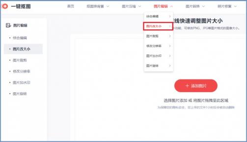 这里给大家演示一下网页端的操作,浏览器打开一键抠图,点击【图片编辑】-【图片改大小】。