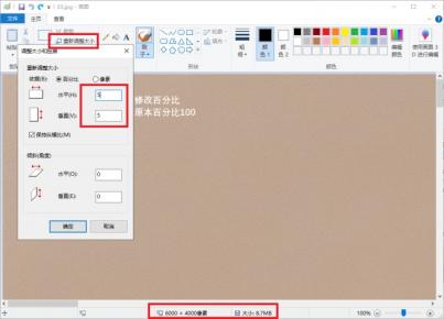 我们可以在打开后的页面下方看到图片原本的像素以及大小,点击【重新调整大小】将图片的水平、垂直百分比进行调整。