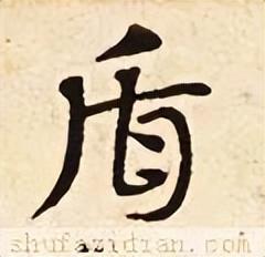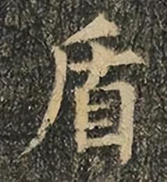 内部上宽下窄,大小适中。长横虚接起笔,抗肩,稍呈俯视,稍长,收笔稍下拉;竖笔起笔稍重,略左斜,渐轻似撇,勿长;最后“目”旁横画等距,不要写宽:左竖斜切起笔,向下稍左斜,略弯,收笔要轻;横折实接起笔,横画勿重,抗肩,略呈俯势,不要写长,到位后稍重顿笔、稍内擫向下写竖,竖身厚重,略弯,与左竖呈相背之势,稍长,收笔稍回锋;里面两小横虚接起笔,位置匀停,稍抗肩,不要重,注意变化;底横实接起笔,抗肩,略呈俯视,收笔注意衔接方法。