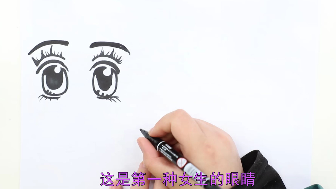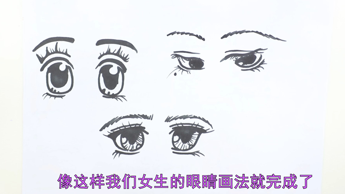 1、画女生的眼睛画法,先来画出眼睛的形状画上睫毛,女生的眼睛要我们画的大一点,画上瞳孔的黑色,女生要画上下眼睑和下睫毛,画上她的眉毛,女生的眉毛可以画的细一点;