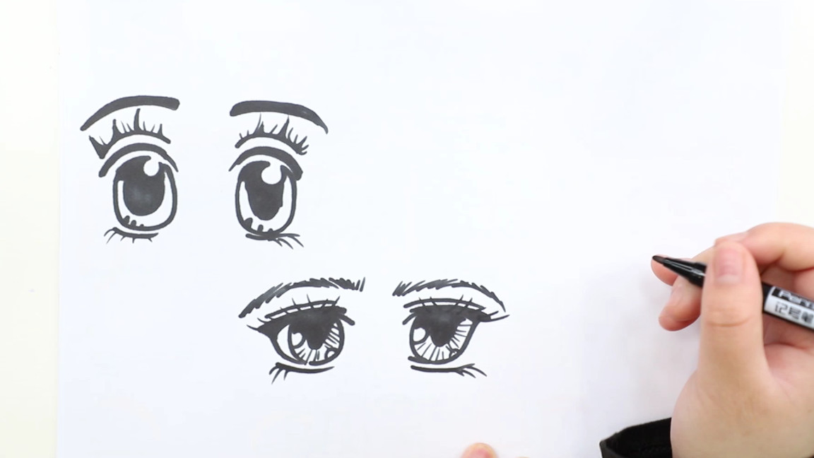 2、第2种女生的眼睛,画出上眼皮的形状,画上她的眼皮,还有她的眉毛;