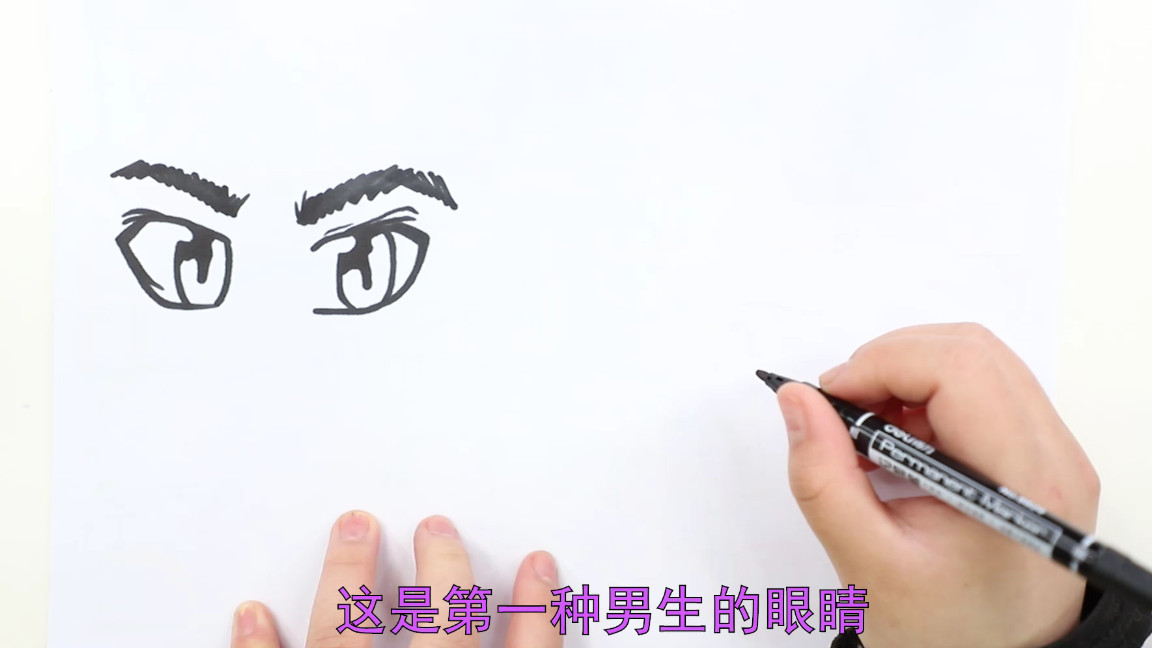 1、第一种先来画出眼睛的形状,画上眼睛,画上他的眉毛,眉毛可以画的粗一点,这是第一种男生的眼睛;