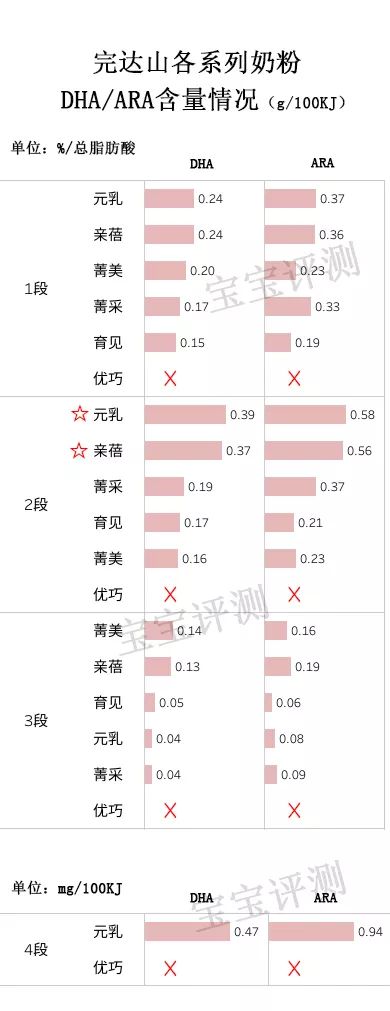 元乳、亲蓓2段DHA添加量较高,得到加分(☆)