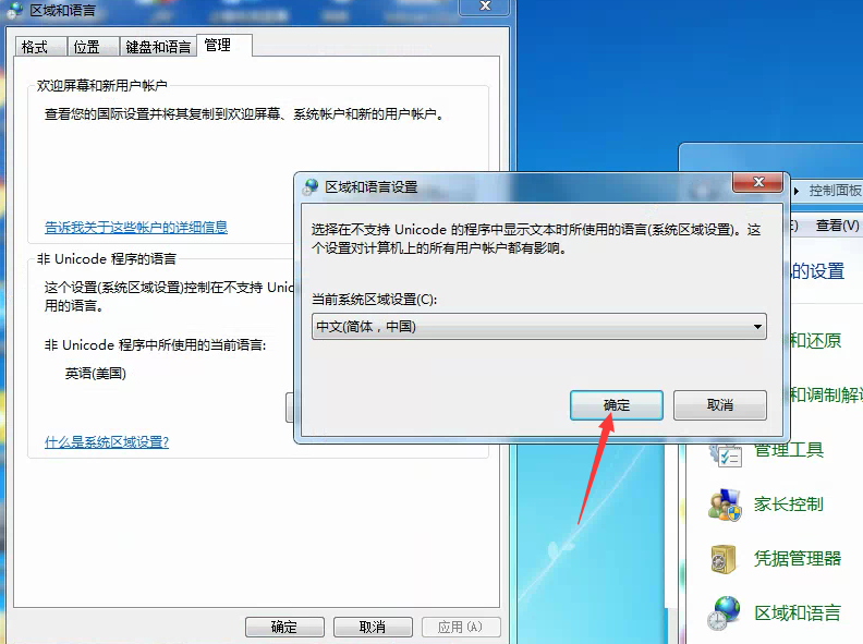 3、把当前系统语言由英语改成简体中文,如果本来就显示简体中文,需要先改成英语,确定后,再改成简体中文。
