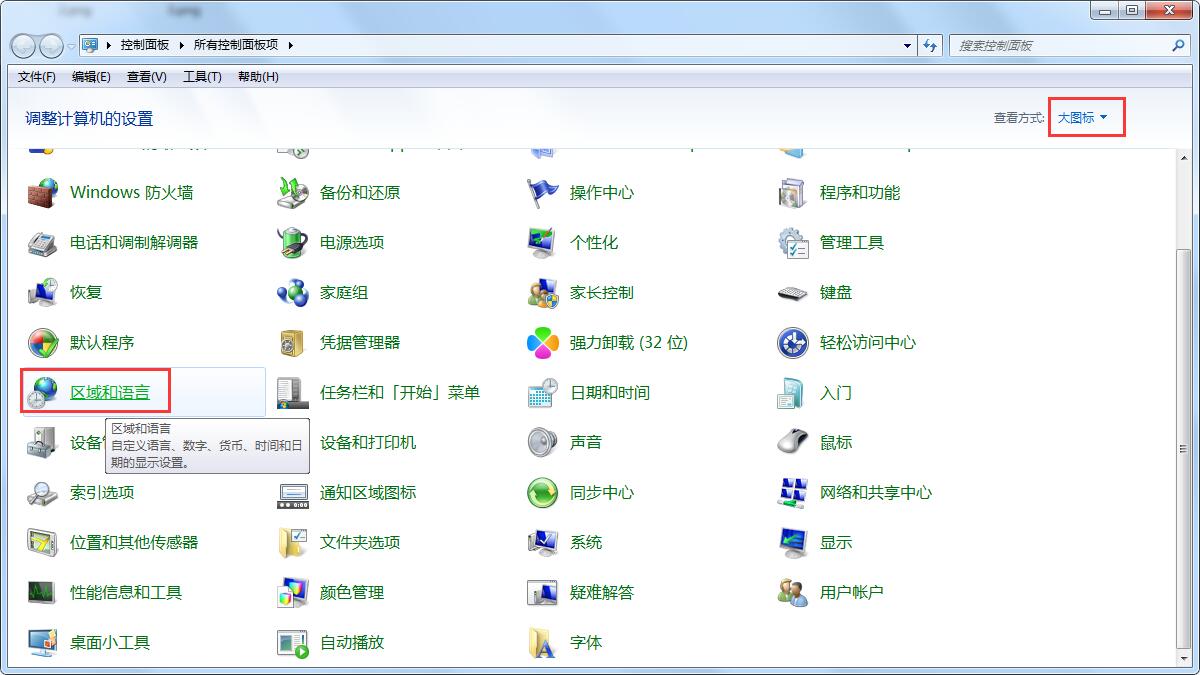 1、进入控制面板,选择“大图标”,再点“区域和语言”,如图: