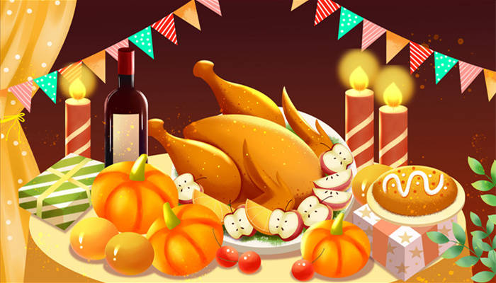 感恩节是美国人合家欢聚的节日,每逢感恩节,美国人家家户户都要吃火鸡。感恩节的晚宴是美国人一年中很重视的一餐,这一餐的食物非常丰富,火鸡是传统主菜,此外,感恩节的传统食品还有甜山芋、玉蜀黍、南瓜饼、红莓苔子果酱、自己烘烤的面包及各种蔬菜和水果等。