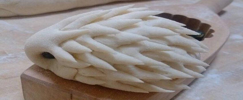 先发好了之后就可以把它拿出来重新揉一下,然后弄成一个一个的小面团,可以制作成小刺猬,在制作的时候可以用剪刀剪出一个个的小刺,然后放在一边备用