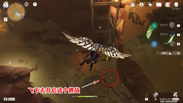 1、玩家需要向山崖下面飞,会触发一个限时挑战。