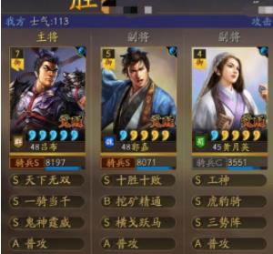 对面的三势吕铁骑驱驰和横戈跃马全部安排上了,绝对的顶配了,最终反倒被低损吃掉。