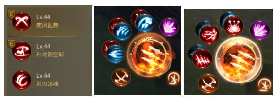 连续技:连续技标识为红色,玩家发动攻击、受到攻击都能积攒怒气值,怒气值提升至上限则会进入斗志状态,斗志状态下,使用主动技后10秒内能使用连续技。每把武器可以装备三个连续技,每个职业可以装备六个连续技。