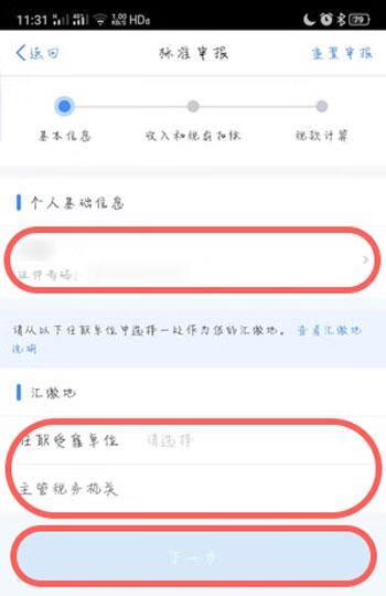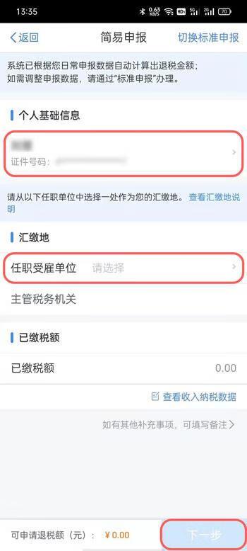 5、简易申报模式下,确认好个人基础信息,选择【汇缴地】,然后点击右下角的【下一步】;