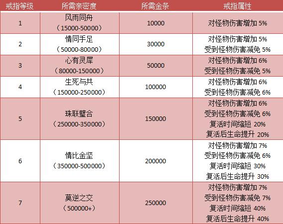 升级后的戒指将拥有更强大的属性,戒指等级总共有7个等级,且随着等级的上升,升级所耗金条也随之上升。
