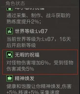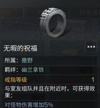 佩戴戒指后与室友组队并且在对方附近时,可获得无暇的祝福增益效果,效果为对怪物伤害的提升,以及减免伤害等强大的属性加持。