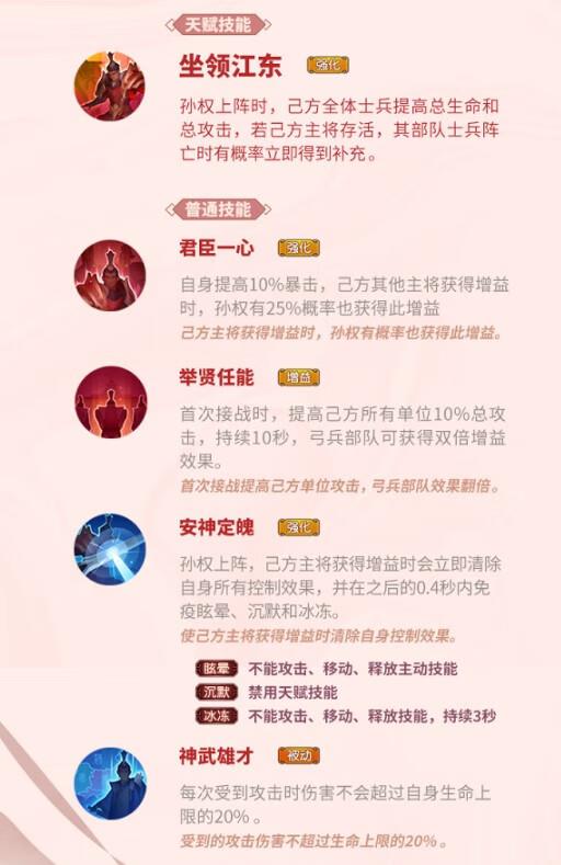 可以提高我方单位攻击,并且己方主将获得增益时,孙权有概率也获得增益。
