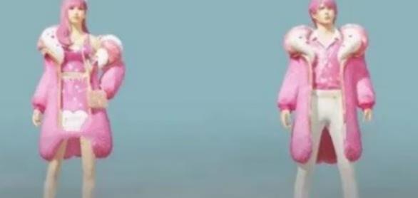 穿的第二款是蓝甜马卡龙,而且是男款。这套时装穿起来就比幻彩马卡龙要好多了,因为它首先给人的感觉就是非常修长 ,可能是因为男性的身高本来就比较高的缘故。而且因为大氅比较长,就给人一种上面和下面比较宽,而中间比较瘦的感觉,整体让人感觉人的身材的很好,很苗条。而背包也是蓝甜马卡龙的一个亮点,白色中带粉色的背包让一个大老爷们背起来虽然感觉到滑稽,但是像极了现实中男孩帮女孩背背包的感觉,非常有爱。