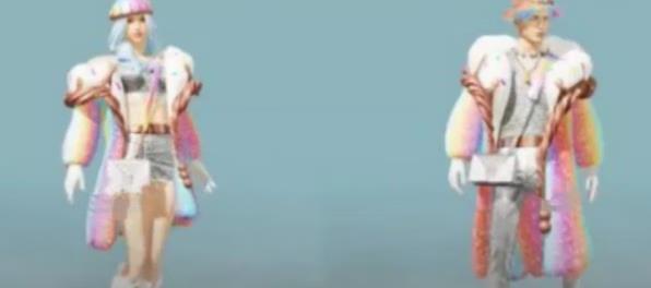 首先,穿的第一款服装是幻彩马卡龙。这套时装在海报中还是非常漂亮的,拥有彩虹般的色彩。而且因为是大款的缘故, 很有名媛范儿。但是从游戏中的视角看,它就没有那么漂亮了。从游戏中的视角只能看到背面,从背面看,它显得很臃肿。带上背包感觉很滑稽的样子,完全没有了海报上的美感。