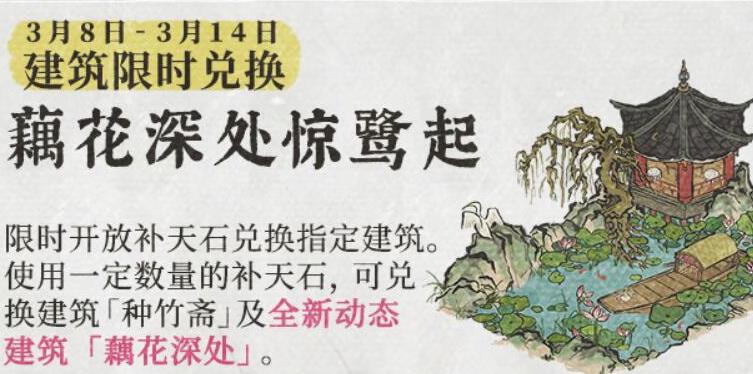 1、限时开放补天石兑换指定建筑。使用一定数量的补天石,可兑换全新动态建筑「藕花深处」。