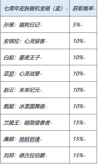2、七周年史诗皮肤幸运宝箱(蓝):孙策猫狗日记、安琪拉心灵骇客、白起昼夜王子、亚瑟心灵战警、赵云未来纪元、甄姬冰雪圆舞曲等,具体皮肤概率如图