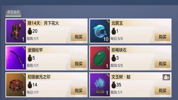 暖春活动期间,会开放专属奖励商店,第一期的【春意盎然】商店中有北冥玉,高级鱼竿,珍稀砆石,破元印礼包等丰厚奖励,此外,大家还可以在商城获得月下花火和蓝色神树摆件。