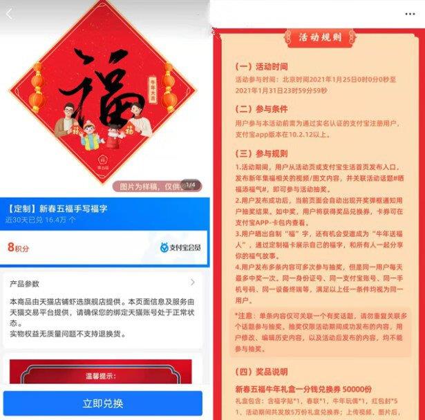 晒福字可抽取50000份新春五福牛年礼盒,1分钱兑换。
