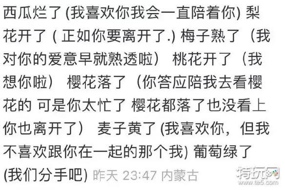 1.西瓜烂了(我喜欢你我会一直陪着你.) 梨花开了(正如你要离开了.) 梅子熟了(我对你的爱意早就熟透啦.) 樱花落了(你答应陪我去看樱花的可是你太忙了樱花都落了也没看上你也离开了.) 麦子黄了(我喜欢你但我不喜欢跟你在一起的那个我.) 葡萄绿了(我们分手吧.) 桃花开了(我想你啦.)
