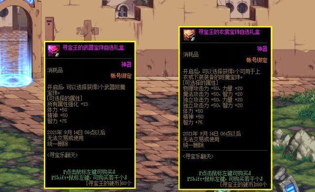 不过寻宝获得的寻宝王硬币,在活动商店兑换的道具还是挺不错的,每周可兑换1个灿烂徽章神秘礼盒,活动持续4周可获得4个,同时还有2张+8增幅券,以及刮刮乐附魔宝珠,以传说勋章自选礼盒等等,其中武器宝珠自选礼盒可在+13全属强、50体力、50精神、75智力选择一种,衣裳宝珠自选礼盒可在50三攻/20力智,50体精、75智力这7种宝珠选择一种。