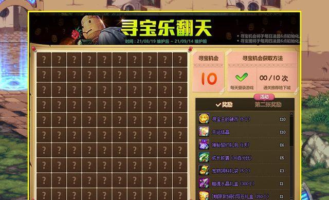 第二个活动是玩家非常熟悉的寻宝乐翻天活动,这个活动在此之前也加入过很多次,玩法非常的简单,只需要同感推荐地下城,然后翻牌寻宝即可。其中在寻宝乐翻天活动中,玩家每次通关1次推荐地下城可获得1次寻宝机会,最多每天可拥有10次寻宝机会,在翻完第一张寻宝图后还可以挑战翻第二张寻宝图。寻宝图除了可以获得寻宝王的硬币道具之外,还可以获得契约、经验胶囊、装备提升礼盒等道具。