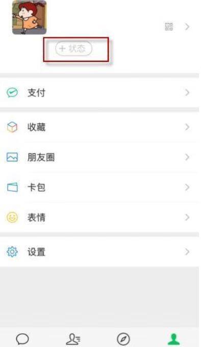 1、打开8.0版本的微信,“我”界面点击“+状态”