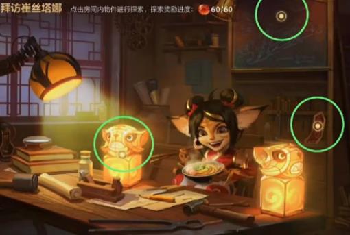 玩家需要在任务提供的这个界面中找到三个线索,拜访崔丝塔娜的线索之一在桌子上,点击桌子上的虎头灯即可,有两个虎头灯,我们要点的是左边的这个。