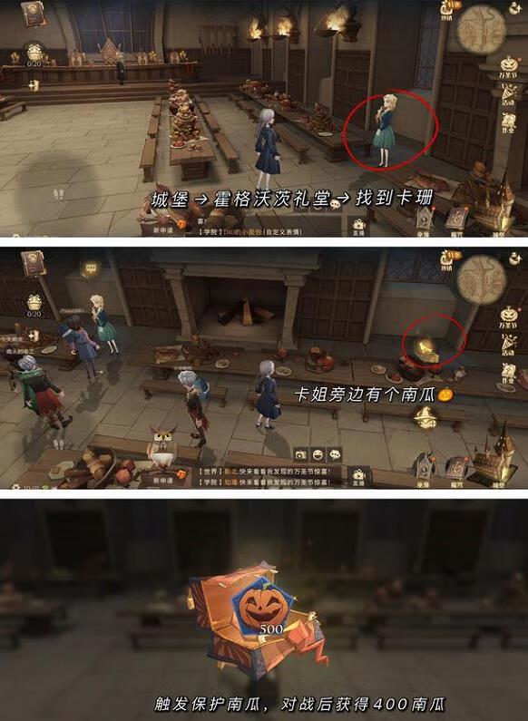 5、在礼堂可以找到卡珊德拉,并且附近会有南瓜出现,玩家点击之后即可触发保护南瓜的剧情,之后会获取400南瓜;