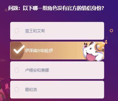 英雄联盟手游中,有很多官方石锤的情侣,每日明星挑战赛中,有一个问题是:“以下哪一组角色没有官方的情侣身份?”。想必,还有很多玩家不知道答案是什么。下面小小编小编为大家带来正确的答案分享,希望可以帮助到大家!
