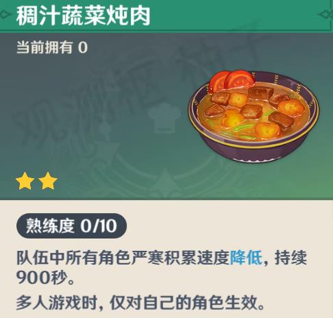 对话并完成世界任务「啊!鲜美的肉!」后获得食谱,学习之后即可制作,能延缓严寒条的积累,持续时间900s。